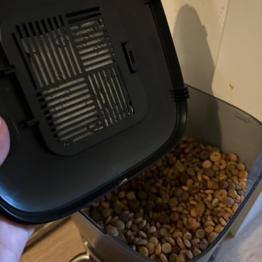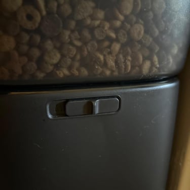Die App-Steuerung ist komfortabel: manuell 1–36 Portionen, automatisch bis zu 12 Zeitpunkte täglich (je 1–36 Portionen). Am Strom ist das Gerät dauerhaft online; im Batteriebetrieb (4×AA) werden WLAN und Display deaktiviert, die Fütterungspläne laufen jedoch exakt weiter. Deckel und Behälter lassen sich verriegeln, sodass nichts aufzuhebeln ist. Kroketten bis etwa 12 mm liefen bei uns – auch in gemischter Größe – ohne Stau.